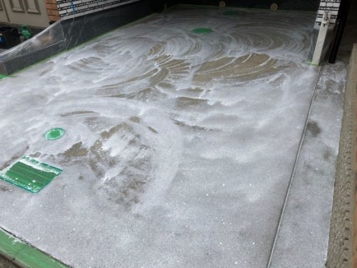 下地処理ケレン清掃し、カチオンセメントで下地調整をし、その上にガレージ専用のユカクリートを塗布しました。